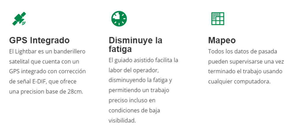 Diseñado para cumplir funciones como una guía de manejo simple, de alta calidad y económica, el Lightbar es un banderillero satelital que se caracteriza por su fácil configuración e interpretación del display de LED. Es ideal para aplicaciones de cultivos de cereales que deban realizarse con precisión submétrica. Su diseño compacto permite instalarlo en cualquier posición del cristal. Un complemento ideal para el Display SBOX®. El Lightbar mapea el trabajo realizado, incluyendo datos de pasada, perímetro, área e información del caudalímetro (si estuviera disponible). Toda esta información puede almacenarse en una unidad USB para ser accedida de manera sencilla desde cualquier computadora.